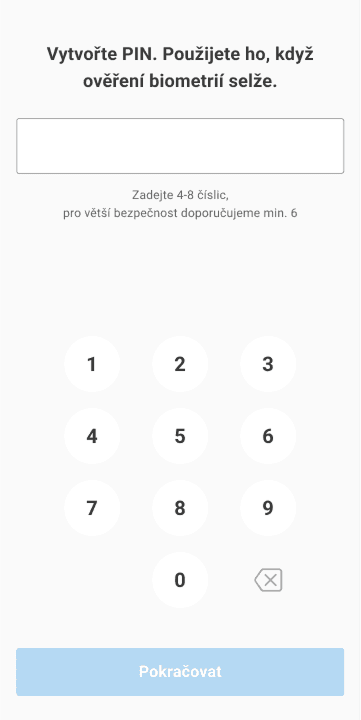 Whether you enable biometrics or not, you also need to set up a numeric PIN. This will be used to log in to the app, or for times when biometric authentication fails. The PIN must be at least four digits, but for security reasons, we recommend a six- to eight-digit PIN. You must enter the PIN twice in a row for verification. Consecutive numbers (e.g. 222222) or simple consecutive number sequences (1234, etc.) are not allowed. The system will not allow you to enter a similar, easily identifiable PIN.